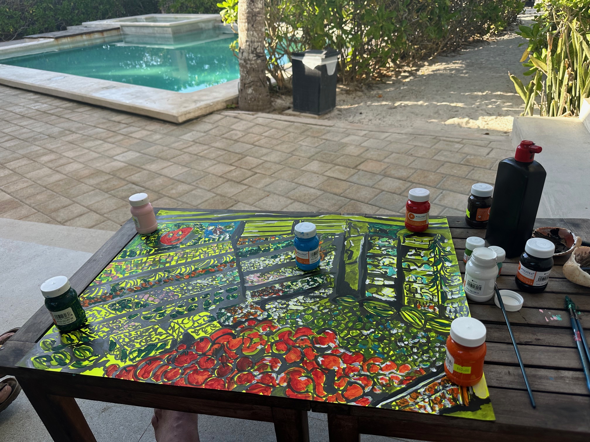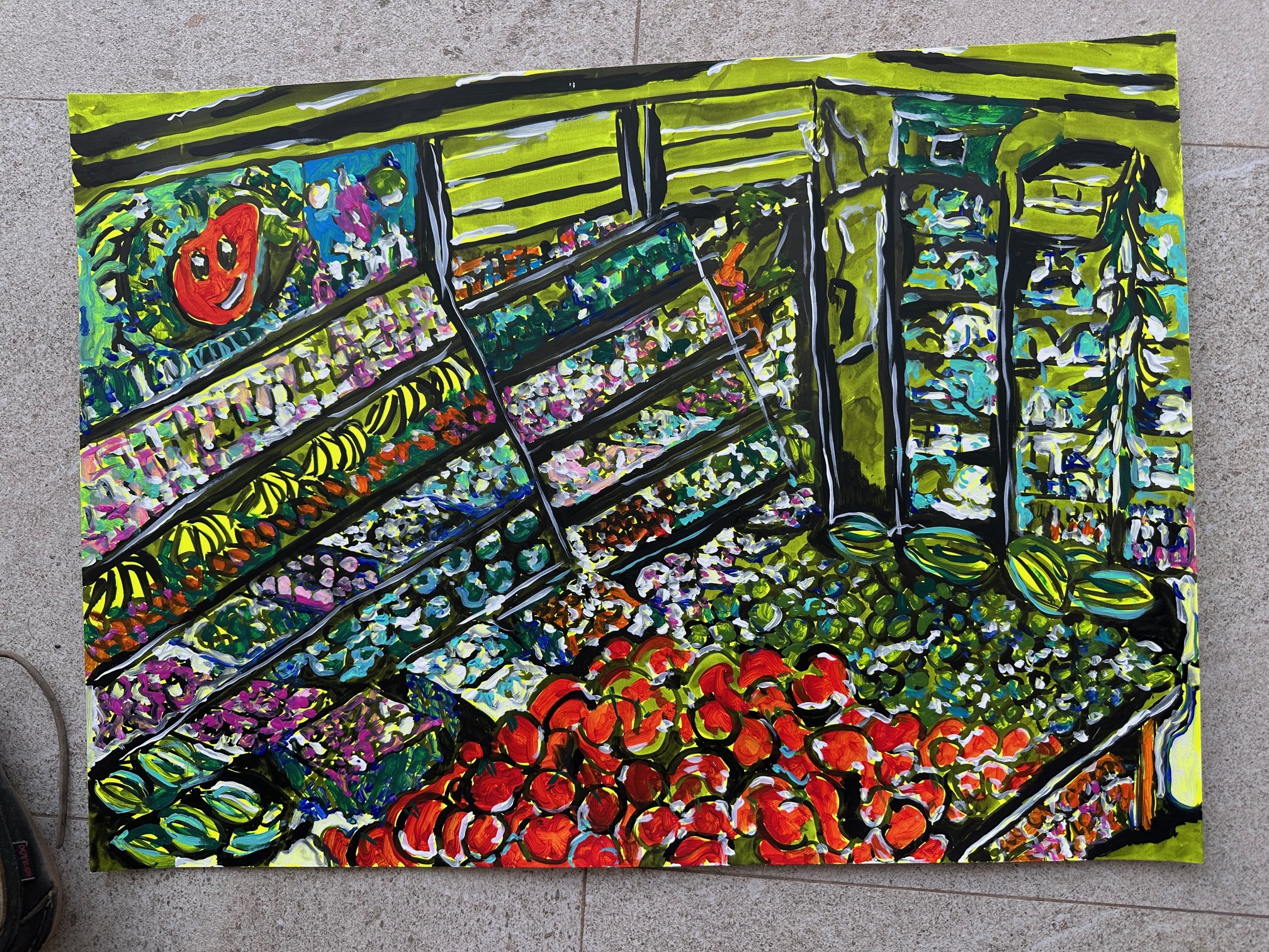 While visiting, I had the opportunity to buy some local paper and acrylics. The combination of the two is quite unusual. The natural high glow of the paper can be used in contrasting and striking ways.